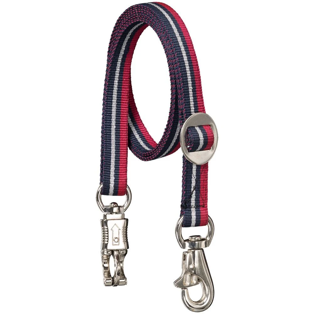 Add a little sparkle to your barn aisle at home or at a show! This tri-color cross tie features a metallic silver stripe and a slide buckle for easy length adjustments. Triggerbull snap at one end and panic snap on the other for improved safety. Sold each.