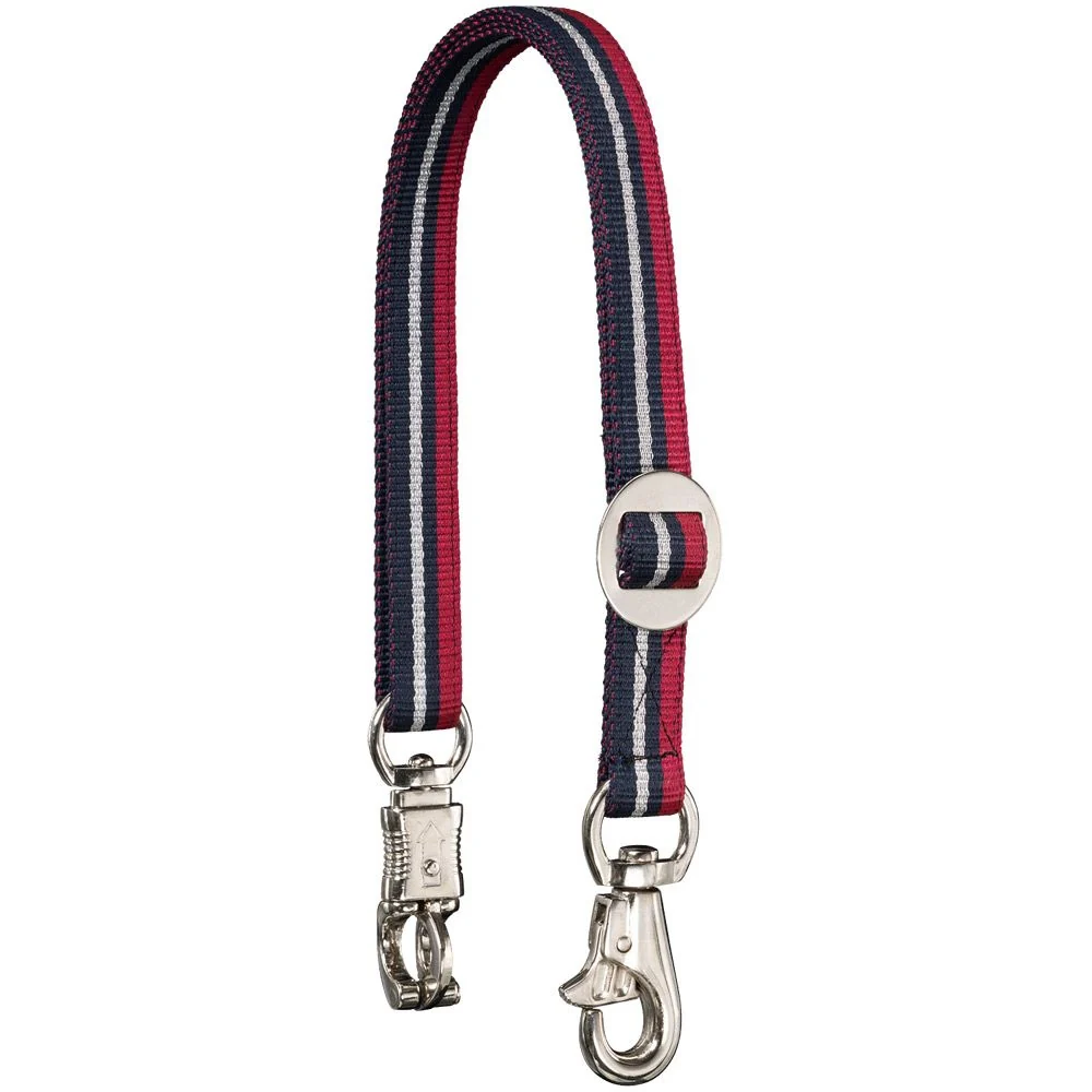 This tri-color trailer tie features a metallic silver stripe, adding a little sparkle to your next trip. One end has an easy-open Triggerbull snap while the other end has a panic snap for improved safety. The length can be easily adjusted with the slide buckle, making this tie great for trailers, inside and out, and also for stalls.